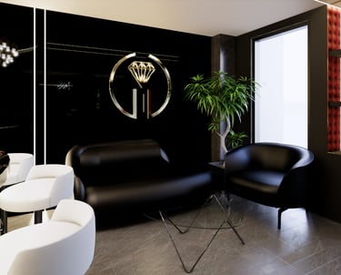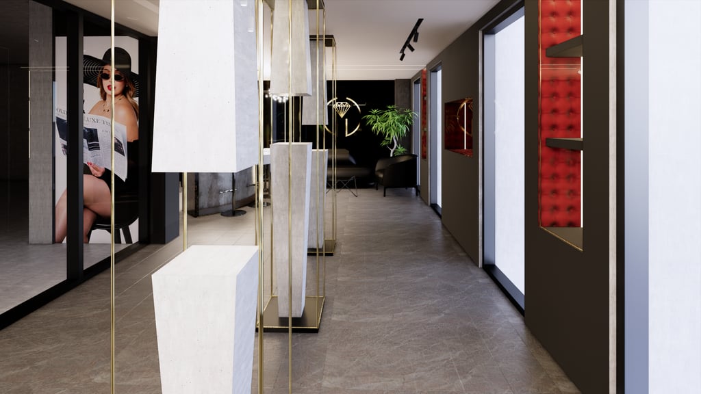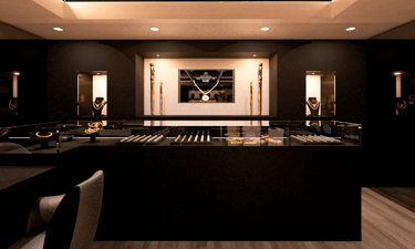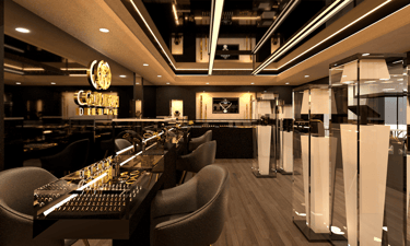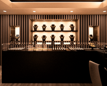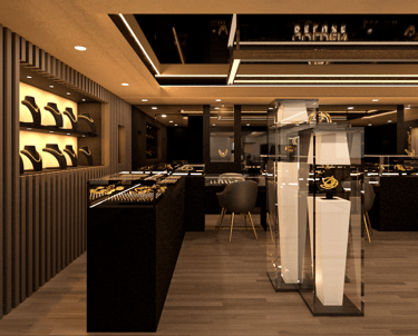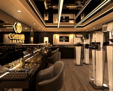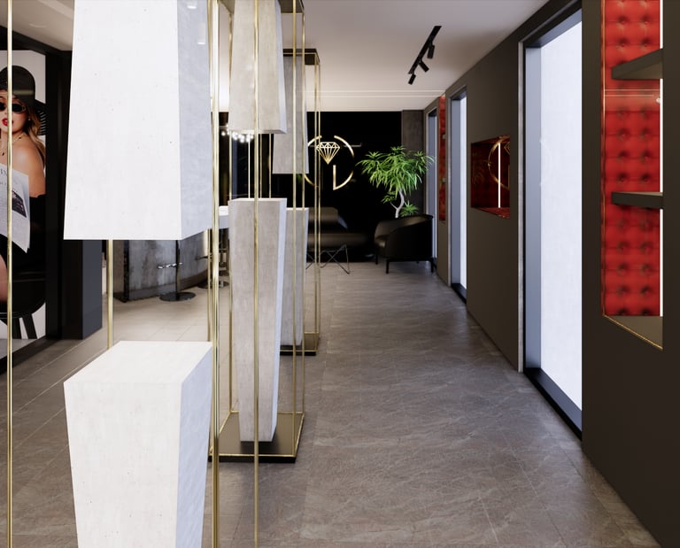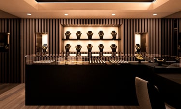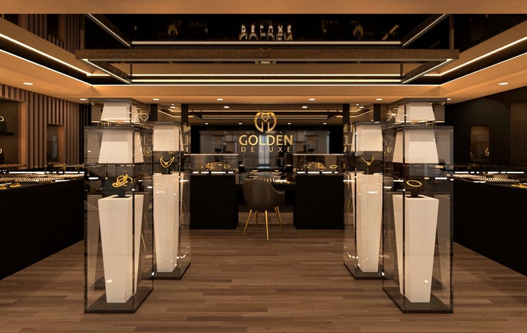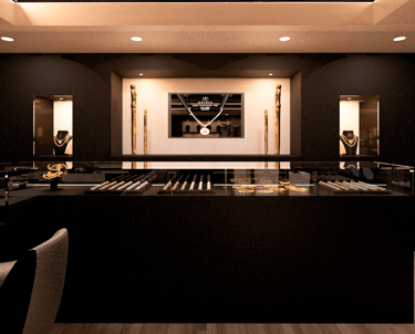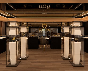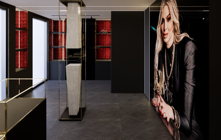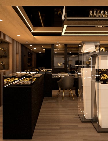 Un espacio diseñado bajo un concepto de exclusividad y sofisticación. La combinación de negros profundos, detalles dorados y una iluminación arquitectónica precisa crea una atmósfera íntima que transforma la exhibición de joyería en una experiencia de arte.