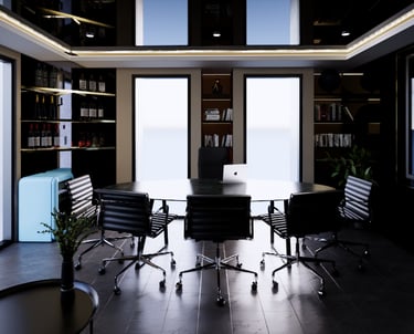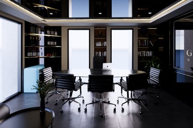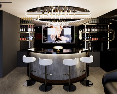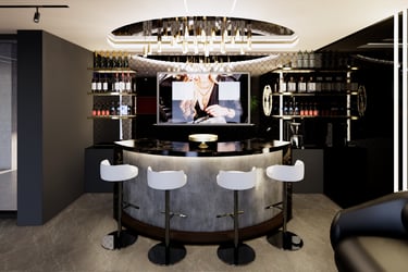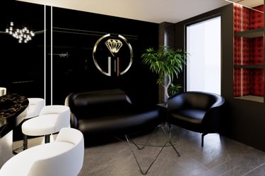 Un espacio diseñado bajo un concepto que fusiona la textura cruda del hormigón con la sofisticación de detalles dorados y una dramática tapicería en rojo intenso. Un gran mural fotográfico define una identidad de marca atrevida y envolvente.