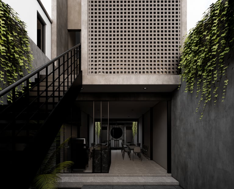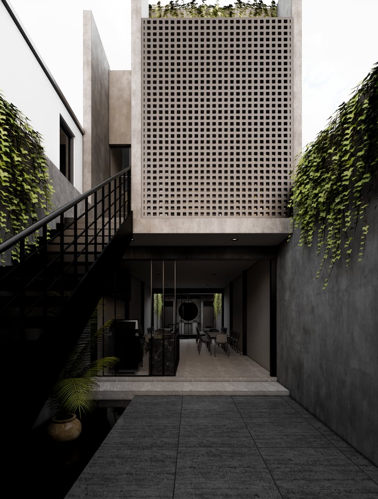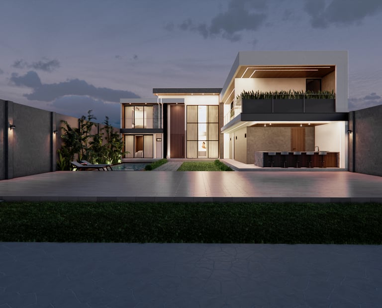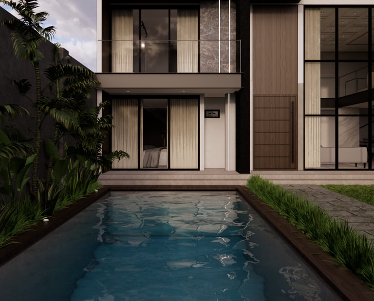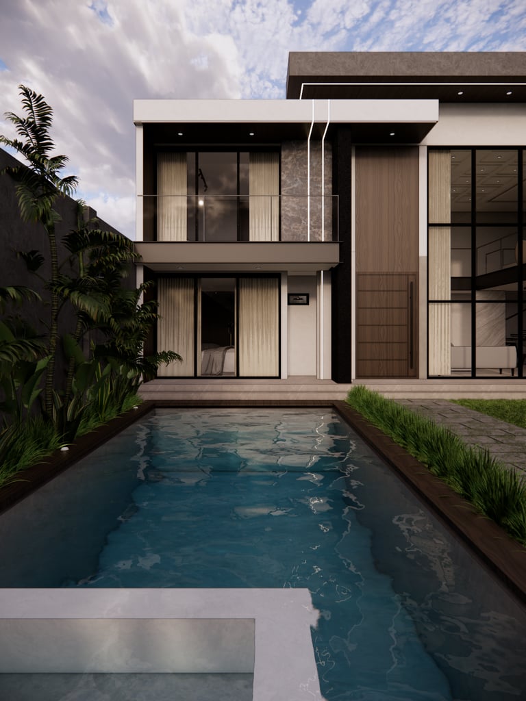 Diseño residencial contemporáneo que prioriza la conexión entre arquitectura y entorno a través de una composición limpia y equilibrada. La volumetría resalta por sus líneas horizontales y dobles alturas, integrando materiales como piedra, madera y vidrio para generar contraste y calidez. La alberca se convierte en un elemento central que articula la relación interior-exterior, mientras que la iluminación y los detalles constructivos refuerzan una atmósfera sobria, elegante y pensada para el confort cotidiano.