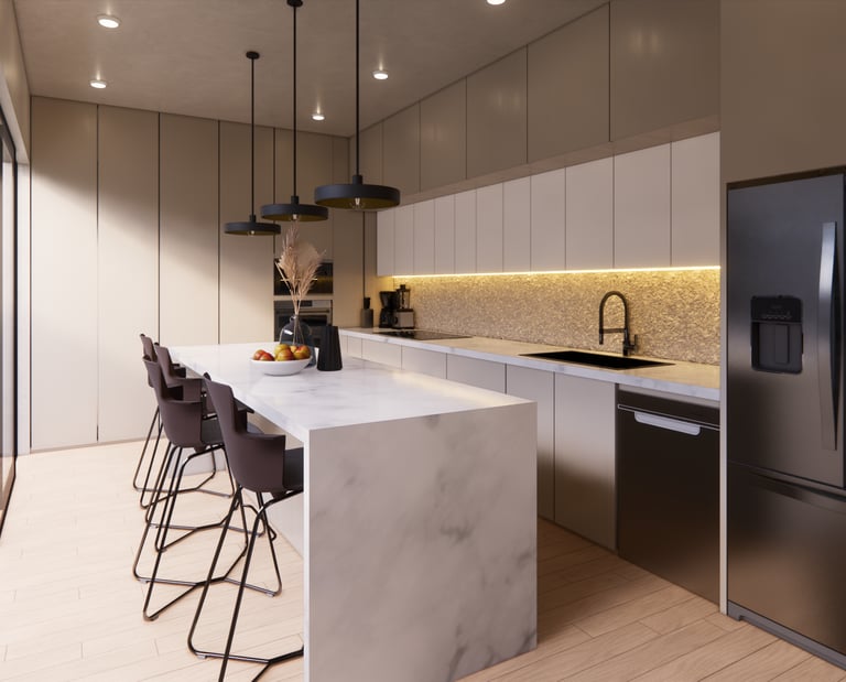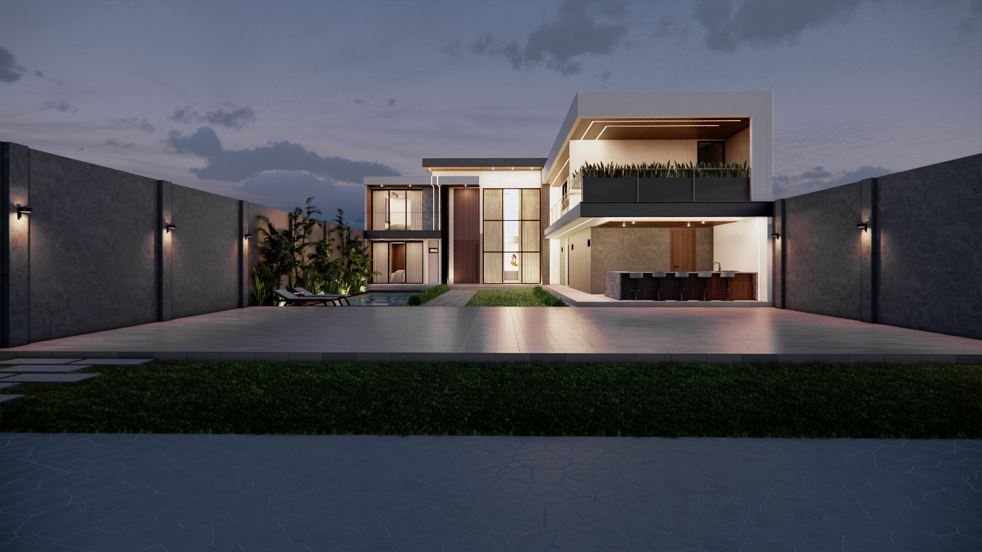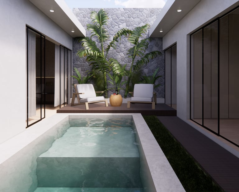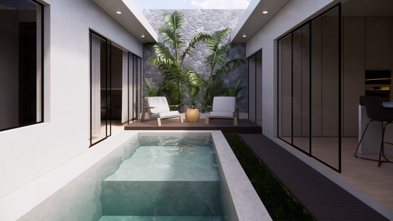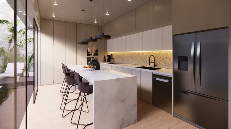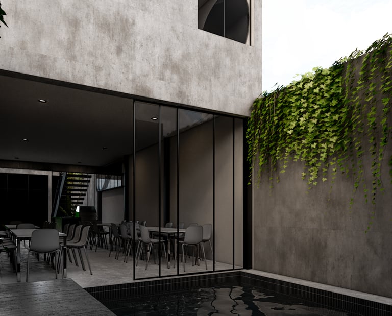 Diseño residencial contemporáneo que prioriza la conexión entre arquitectura y entorno a través de una composición limpia y equilibrada. La volumetría resalta por sus líneas horizontales y dobles alturas, integrando materiales como piedra, madera y vidrio para generar contraste y calidez. La alberca se convierte en un elemento central que articula la relación interior-exterior, mientras que la iluminación y los detalles constructivos refuerzan una atmósfera sobria, elegante y pensada para el confort cotidiano.